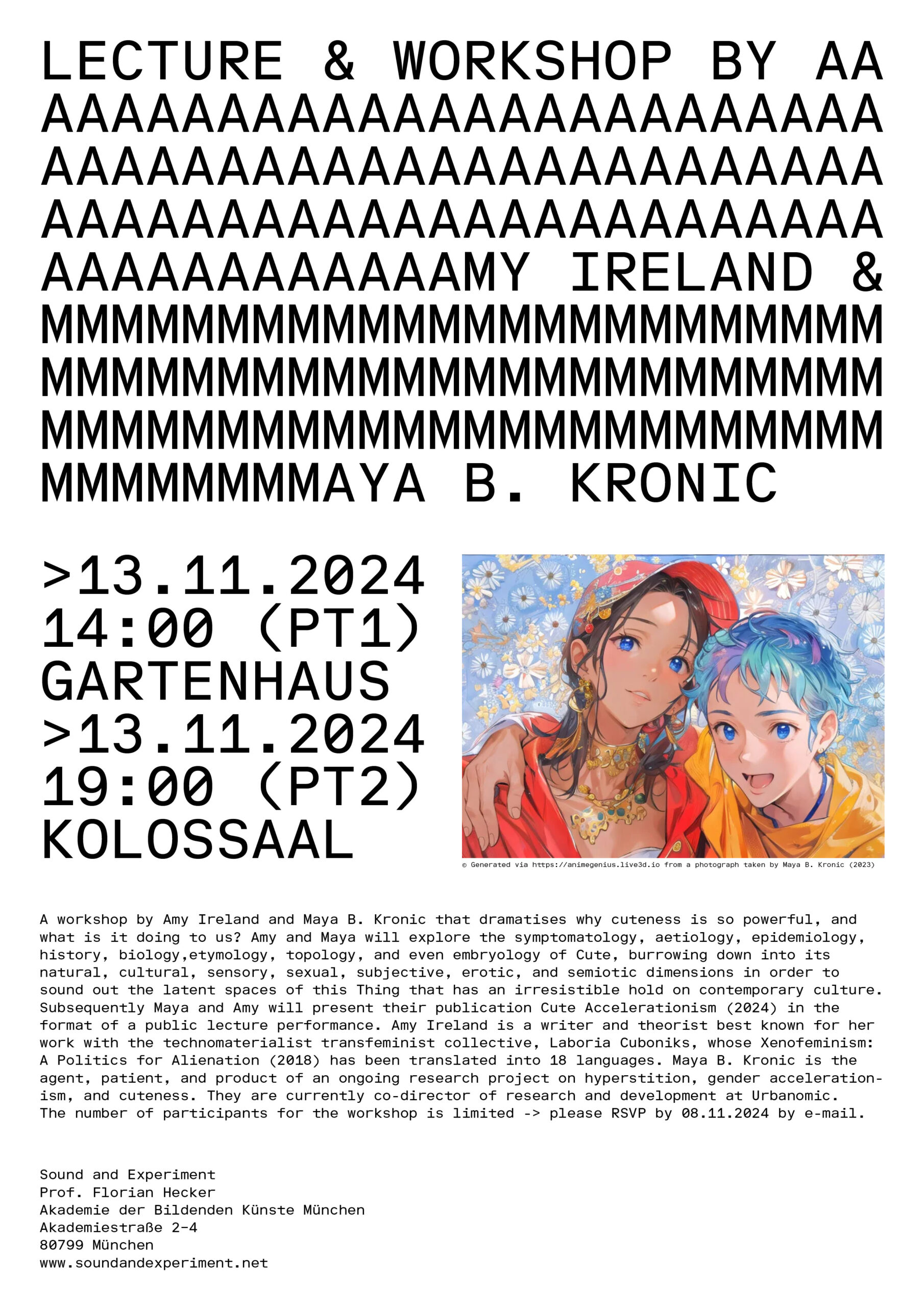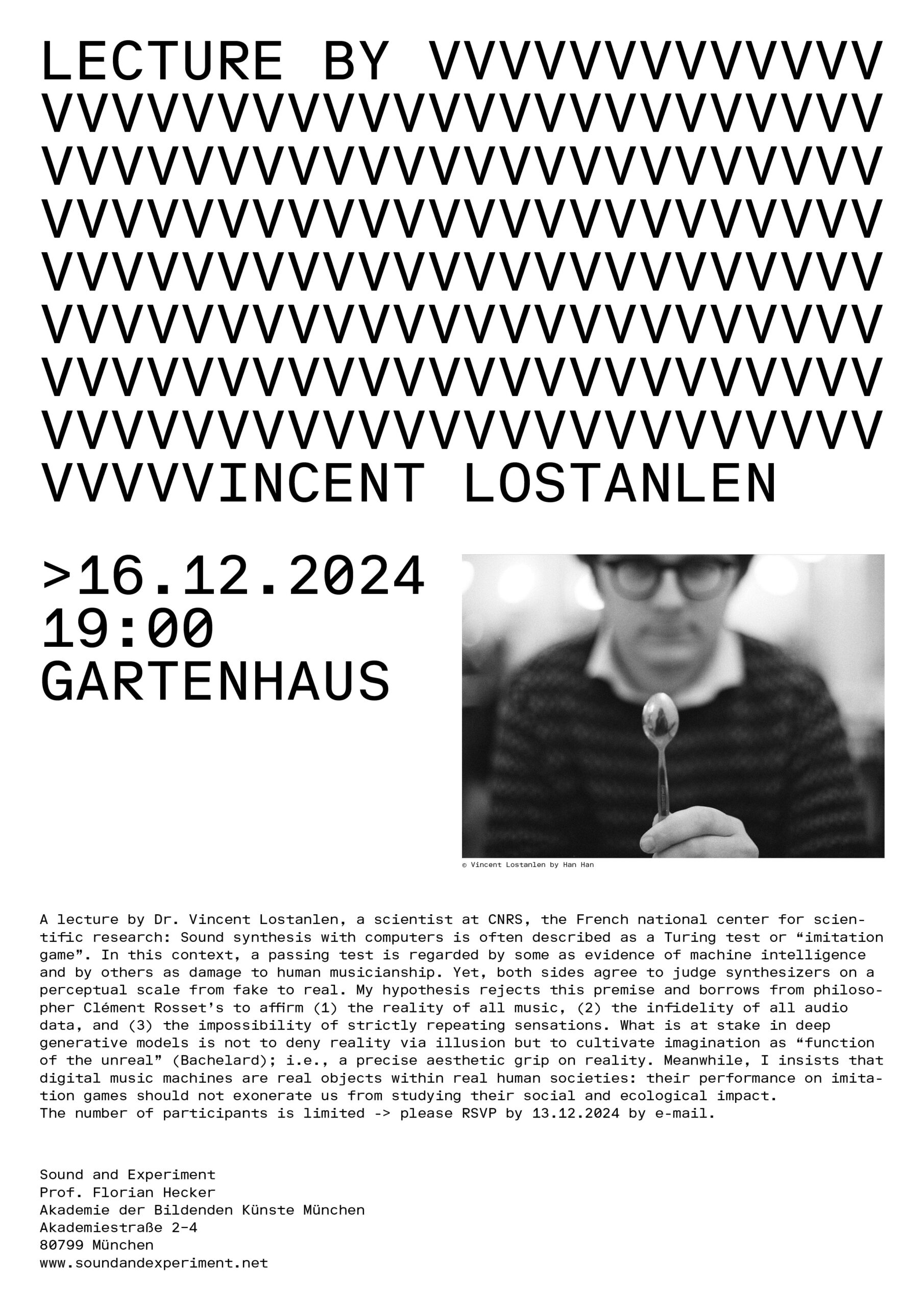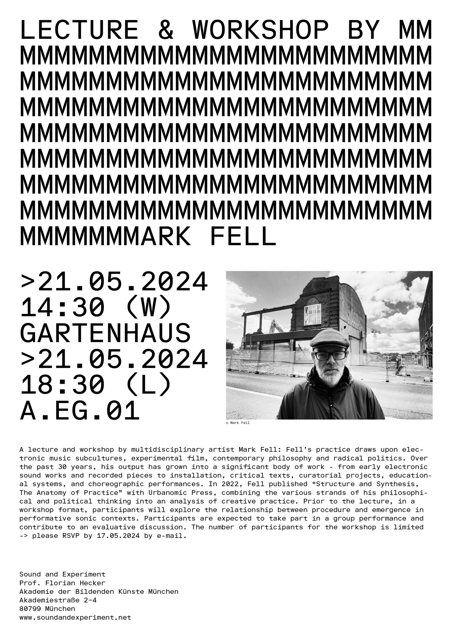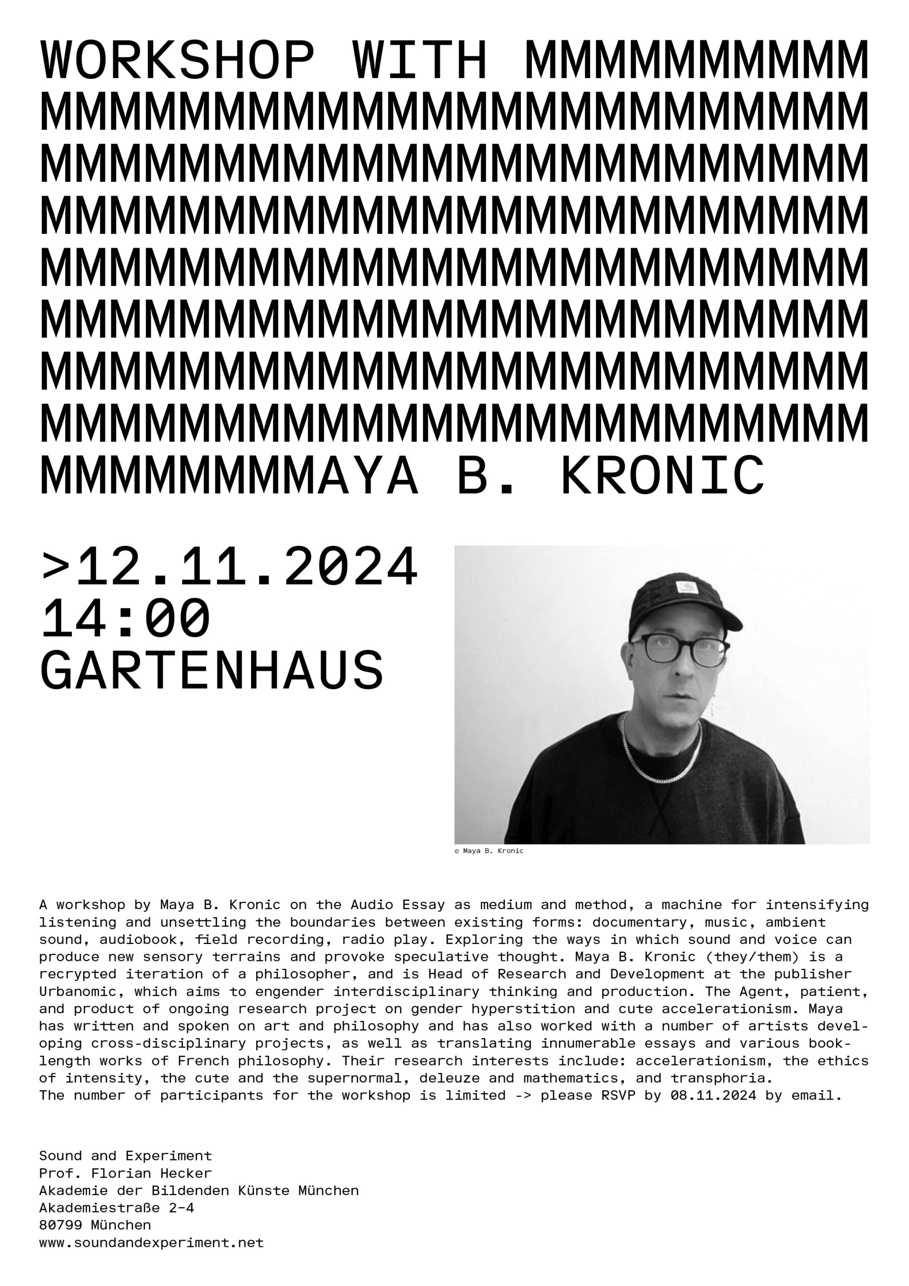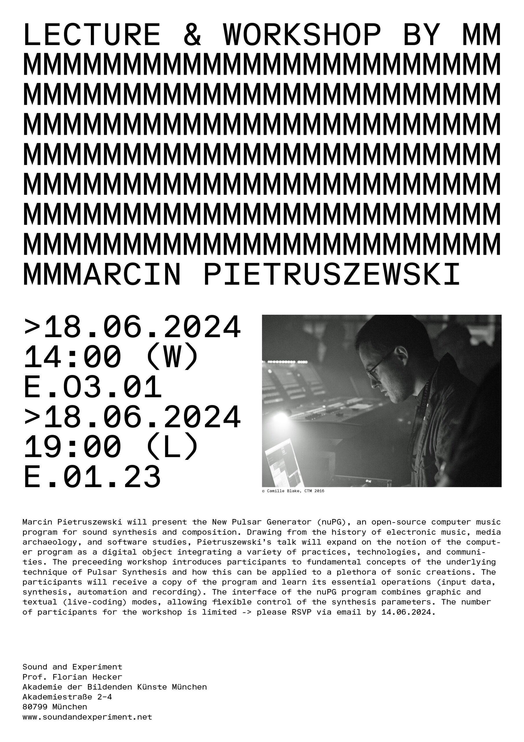 Sound and Experiment is a cross-class platform, interested parties as well as enrolled students of the AdBK who are interested in the program are asked to contact Prof. Florian Hecker directly.